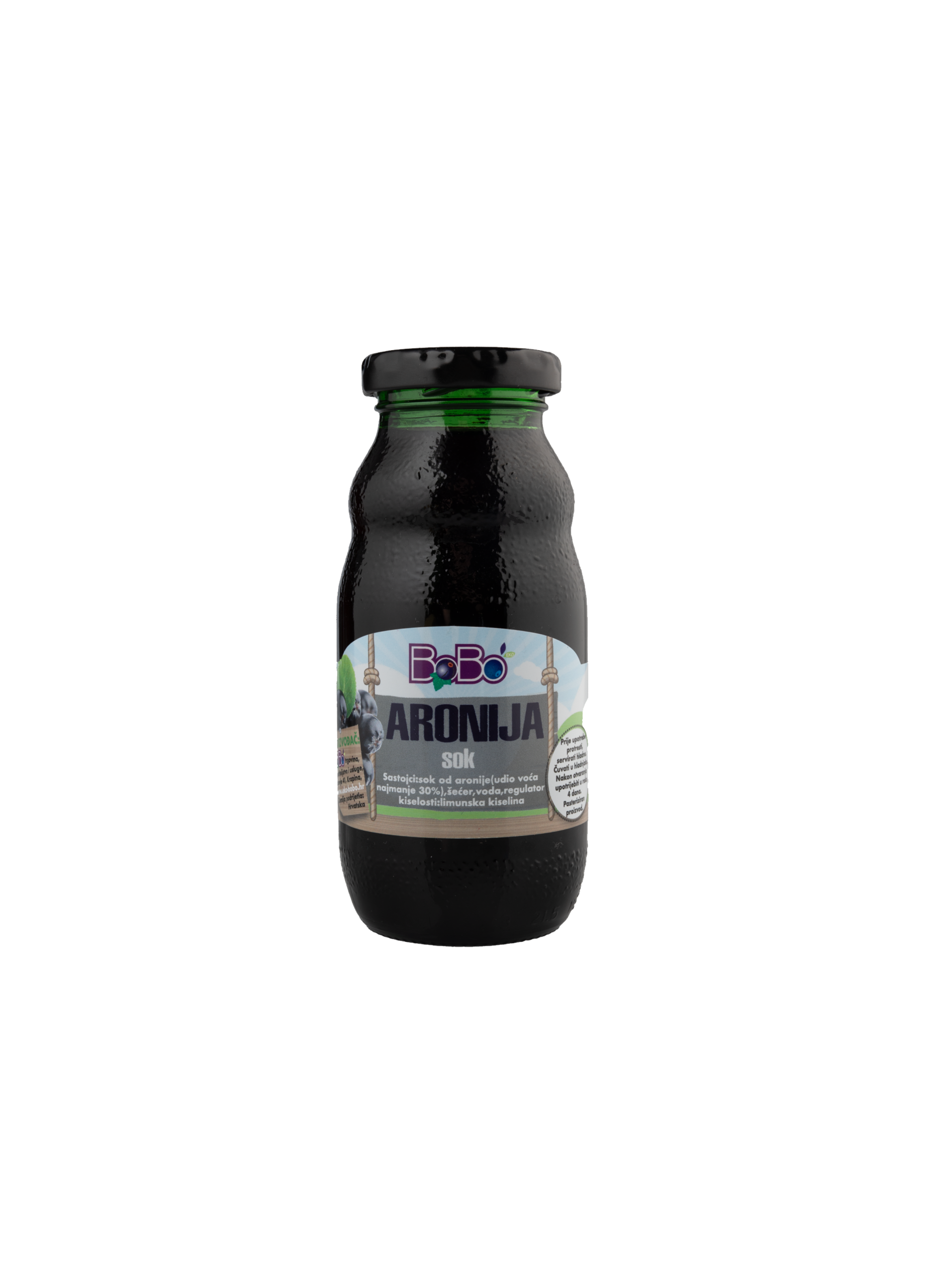 Sok napravljen cijeđenjem aronije. Sastav: sok aronije 30%, šećer, lim.kiselina i voda. Pasteriziran, bez konzervansa i umjetnih bojila. Aronija se odlično pokazala kod razlićitih bolesti: šećerna bolest, povišen kolesterol u krvi, raka… Aronija popravlja krvnu sliku, poboljšava cirkulaciju, regulira tlak. Dobra je za imunitet i čišćenje organizma. Održava vitalnost organizma i dobar  vid.